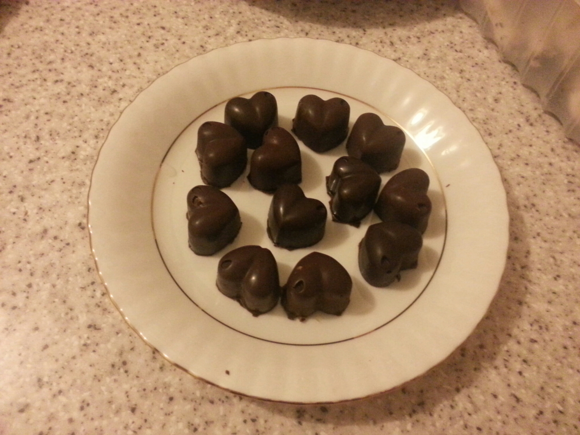 Czekolade rozpuscic w kapieli wodnej czyli podzielic czekolade i wlozyc do miseczki al’a porcelanowej a miseczke do garnka z woda podgrzewac az czekolada sie rozpusci, nastepnie wykladac czekolade na wglebienia uformowanych serduszek. Starac sie by czekolada byla dobrze rozprowadzona. Wlozyc do lodowki na okolo 40 min. W tym czesie przygotowac galaretke czyli do pol szklanki goracej wody wsypac galaretke I mieszac do rozpuszczenia sie skladnikow. Zostawic do wystudzenia I lekkiego stezenia /nie wkladac do lodowki bo bedzie za twarda. Po 40 min wyciagnac z lodowki foremki z czekolada I wlac okolo 1 lyzeczki galaretki lub 2/3 wypelnienia I wstawic na pol godziny do lodowki. Na koniec wylac na galaretke reszte czekolady z miseczki, jezeli zrobi sie twarda to podgrzac ja ponownie . Wygladzic nozem I wstawic na okolo pol godziny do lodówki. Serduszka po tym czasie lekko wyduszac I ukladac na talerzu;) smacznego