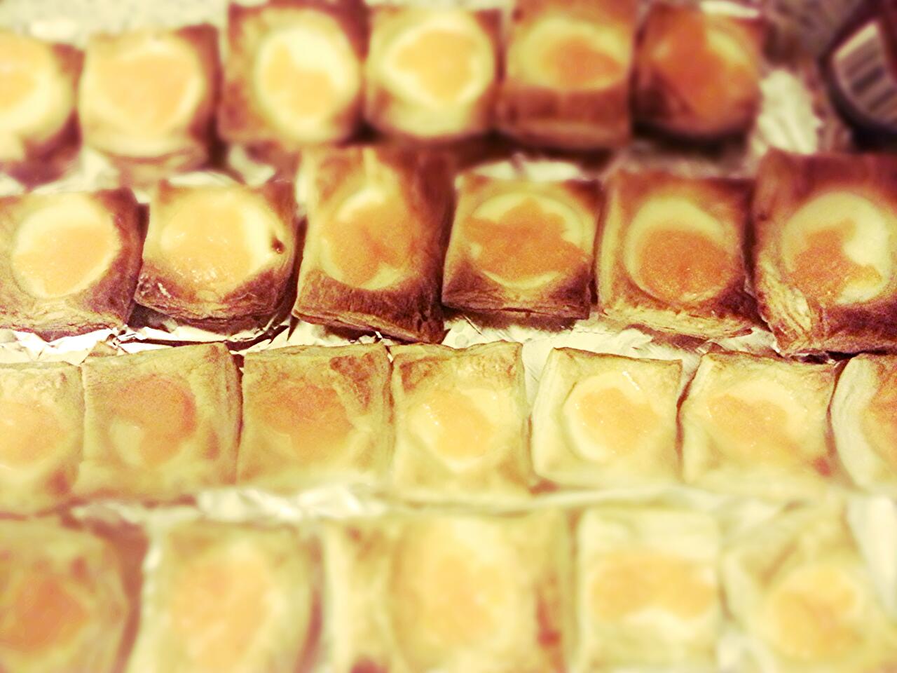 Ciasteczka bardzo proste, wykonane z gotowego ciasta francuskiego. Ciasto kroje na prostokaty i wkladam do niskiej formy przeznaczonej na okolo 12 babeczek. Ciasto smaruje roztrzepanym jajkiem a nastepnie wypelniam kawalkiem brzoskwini i pieke okolo 10-15 min do zrumienienia w 200 stopniach. Nastepnie po wystudzeniu przekladam na folie aluminiowa i zalewam brzoskwiniowa galaretka rozpuszczona w 150 ml goracej wody -rowniez wystudzonej. Poczekac az galaretka stezeje.