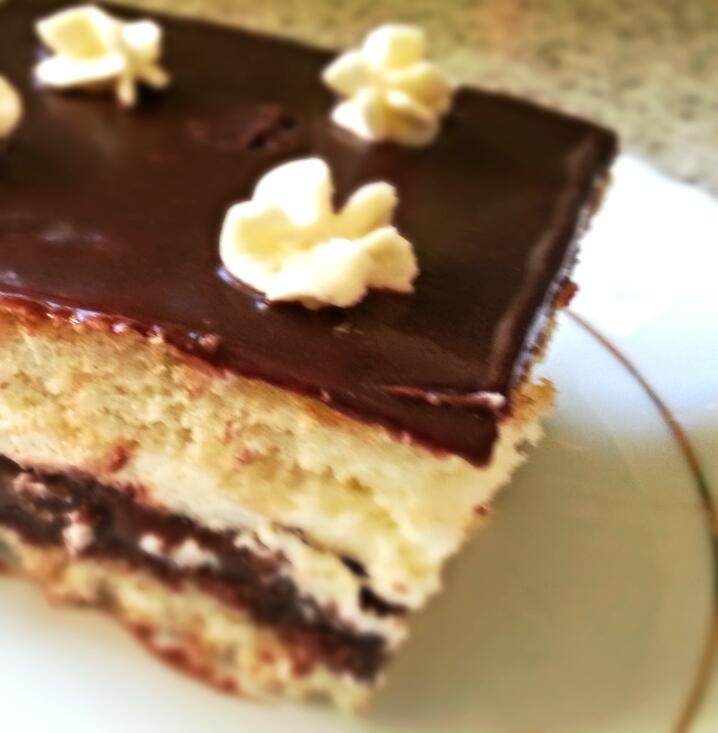 Białka ubić z cukrem, dodać żółtka a następnie mąkę z proszkiem do pieczenia i dobrze wymieszać. Wylać do prostokątnej formy wylozonej papierem do pieczenia. Piec w 180 stopniach przez około 20 do 30 min do suchego patyczka