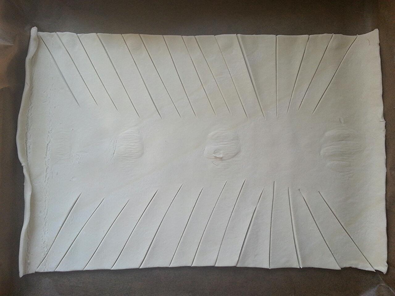 Ciasto francuskie wylozyc na papierze do pieczenia nastepnie ponacinac boki na rowne paseczki