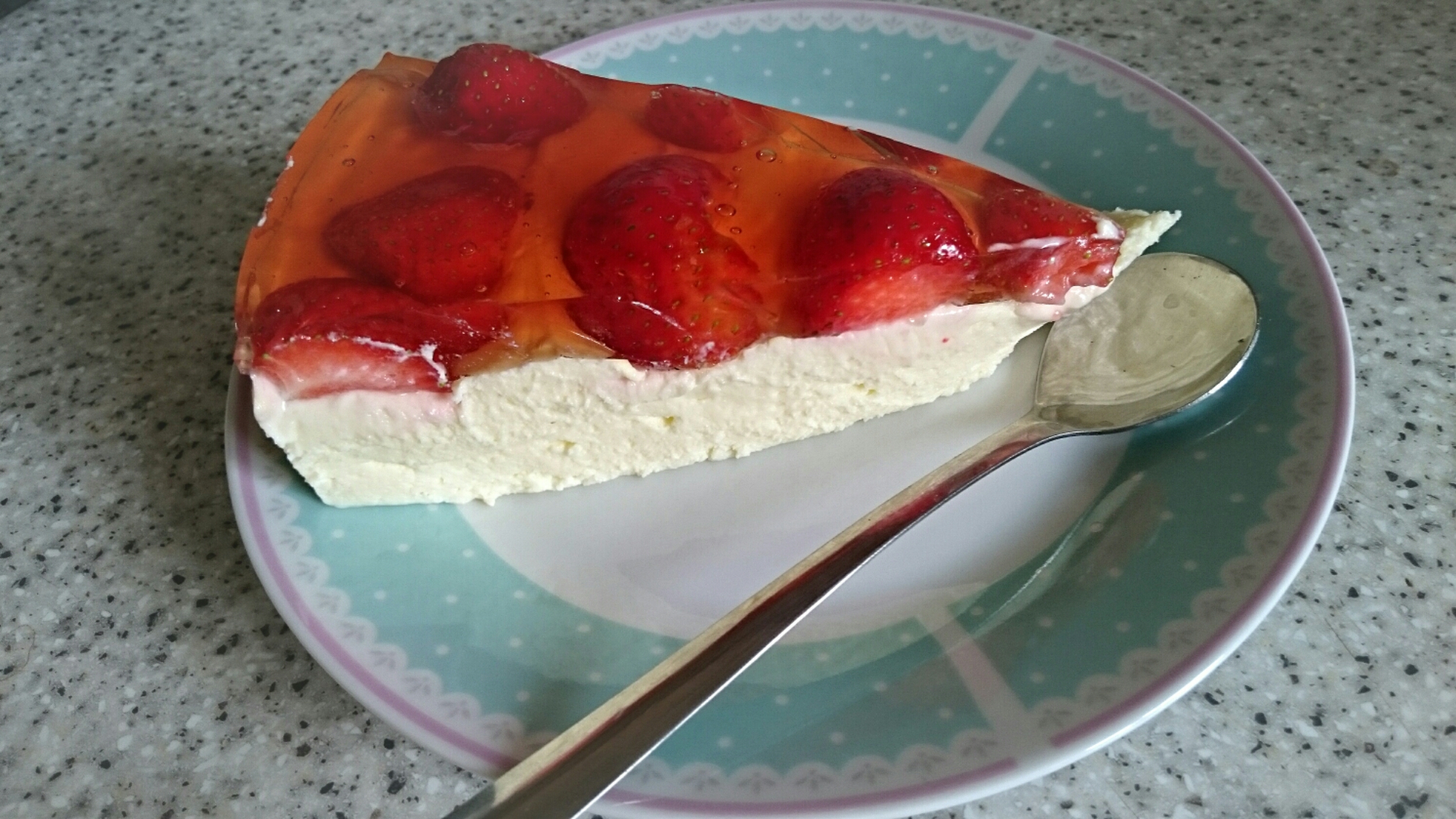 Na masę wyłożyć przekrojone truskawki a następnie zalać rozpuszczona galaretka, która musi być trochę stezala. Włożyć do lodówki najlepiej na całą noc.