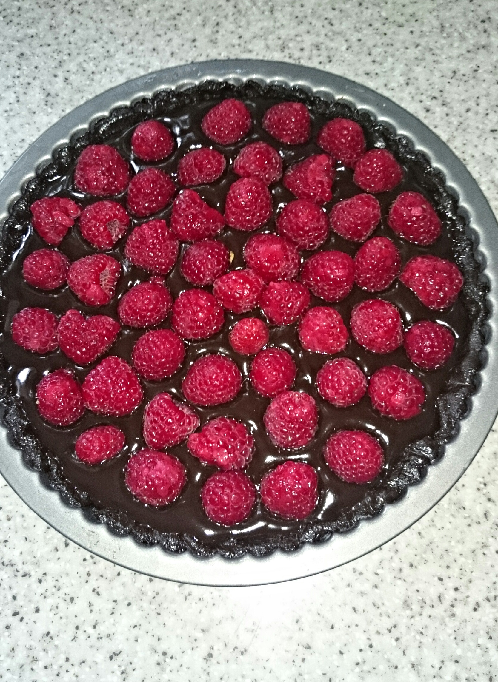 Masę czekoladową wylać na spód, ułożyć maliny i wstawić do lodówki na ok. 3 godziny lub do czasu aż masa zesztywnieje.