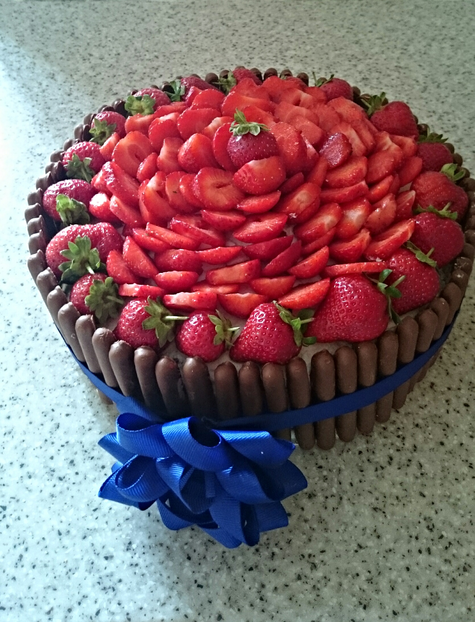W tym czasie ubić śmietanę z cukrem pudrem. Żelatyne rozpuścić w goracej wodzie. Jak przestygnie dodac do niej łyżkę bitej smietany i wymieszać , a nastepnie wlać całość do bitej smietany. Jeszcze chwilke ubić wszystko razem. Nastepnie smarowac boki i gore tortu śmietaną . Na boki natomiast przyklejac czekoladowe paluszki i zwiaezac wszystko wstążka . Górę przystrajac truskawkami wedle uznania.