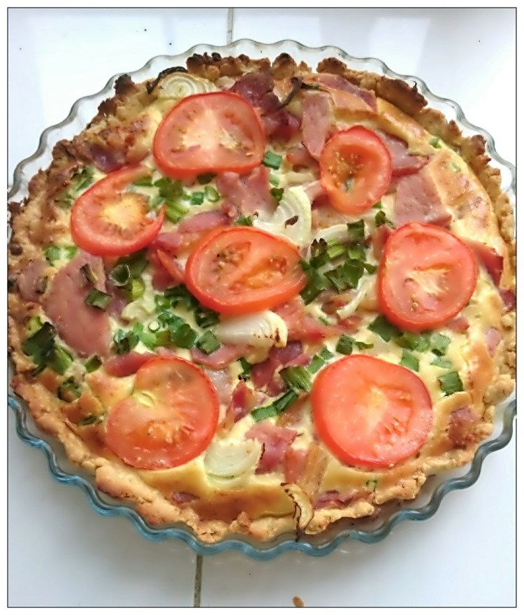Śmietanę i jajka wymieszać na jednolitą masę dodać trochę sera, sól i pieprz. Masę wylać na wcześniej przygotowane ciasto. Wysypać resztę sera, szynkę, cebule i szczypiorek.
