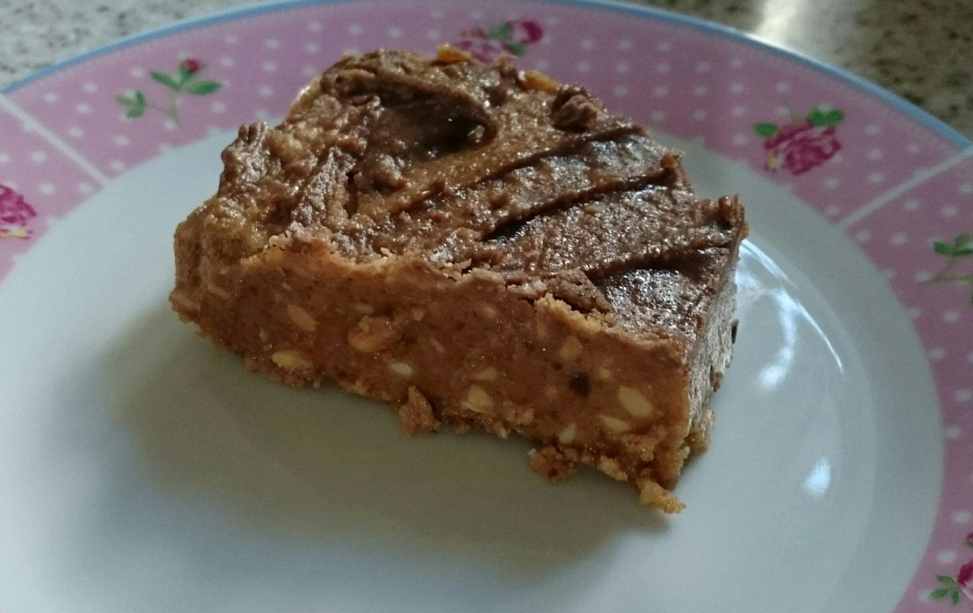 2. Ciastka rozdrobnic w procesorze a następnie wymieszać z miękkim maslem i masłem orzechowym aż będzie jednolita masa. Następnie masę wyłożyć do formy ok. 29×23 cm i włożyc do lodówki by masa zastygla.