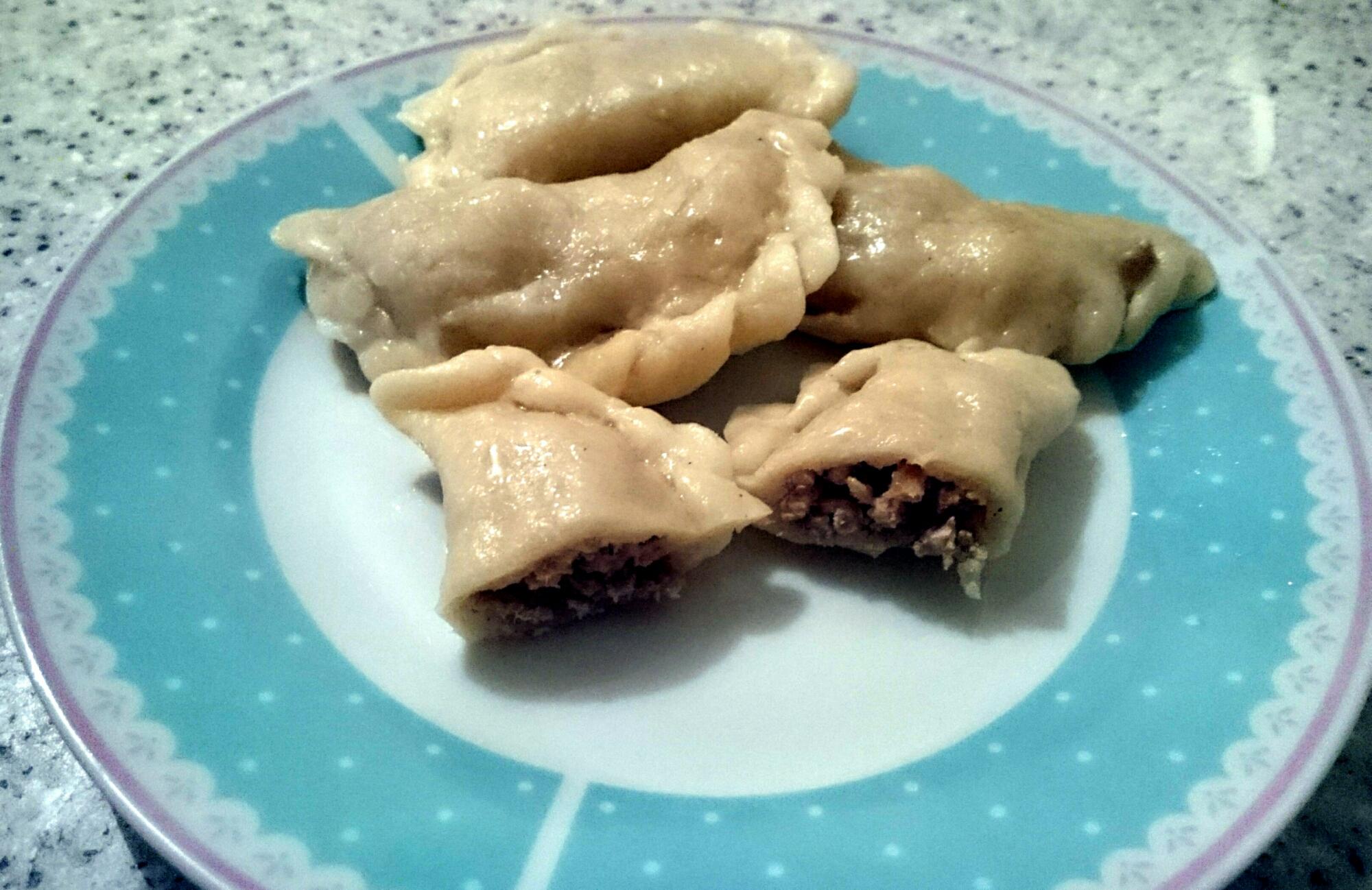 Do przesianej maki wlac goracej wody i wymieszac łyżka poczekac aż ostygnie a nastepnie dodać oliwy i ugniatac ciasto az bedzie jednolite. wykrawac szklanka kółka nakladac okolo pol lyzeczki nadzienia i formowac pierogi