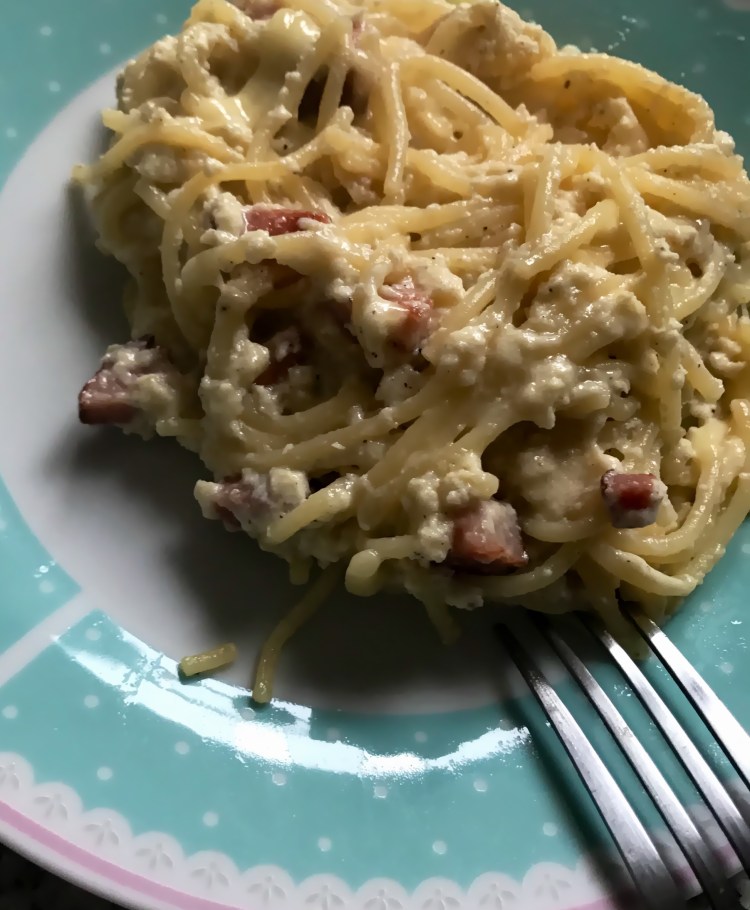 4 Ugotowany makaron dodać do gorącego boczku, wymieszać i przysmażyć przez ok. 1minuty. Dodać masę jajeczną i mieszać przez chwilę, aż wszystkie składniki dobrze się połączą, a sos lekko zgęstnieje. (Nie mieszać za długo, żeby nie zrobiła się jajecznica!). Wyłożyć na talerze i posypać resztą sera.