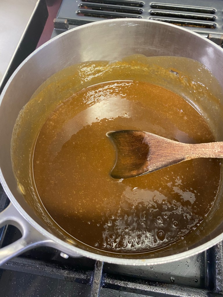 Wszystkie składniki umieścić w niewielkim garnku. Wymieszać, zagotować na średniej mocy palnika, gotować przez około 3 minuty, często mieszając, do zgęstnienia sosu. Odstawić (sos będzie gęstniał w miarę chłodzenia).