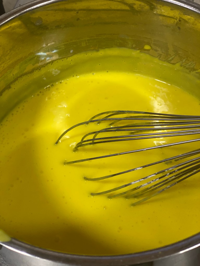 - 2/3 mleka podgrzewaj w garnku na wolnym ogniu z dodatkiem masła. Resztę mleka wymieszaj z cukrem, roztrzepanymi żółtkami jaj oraz mąką ziemniaczaną.