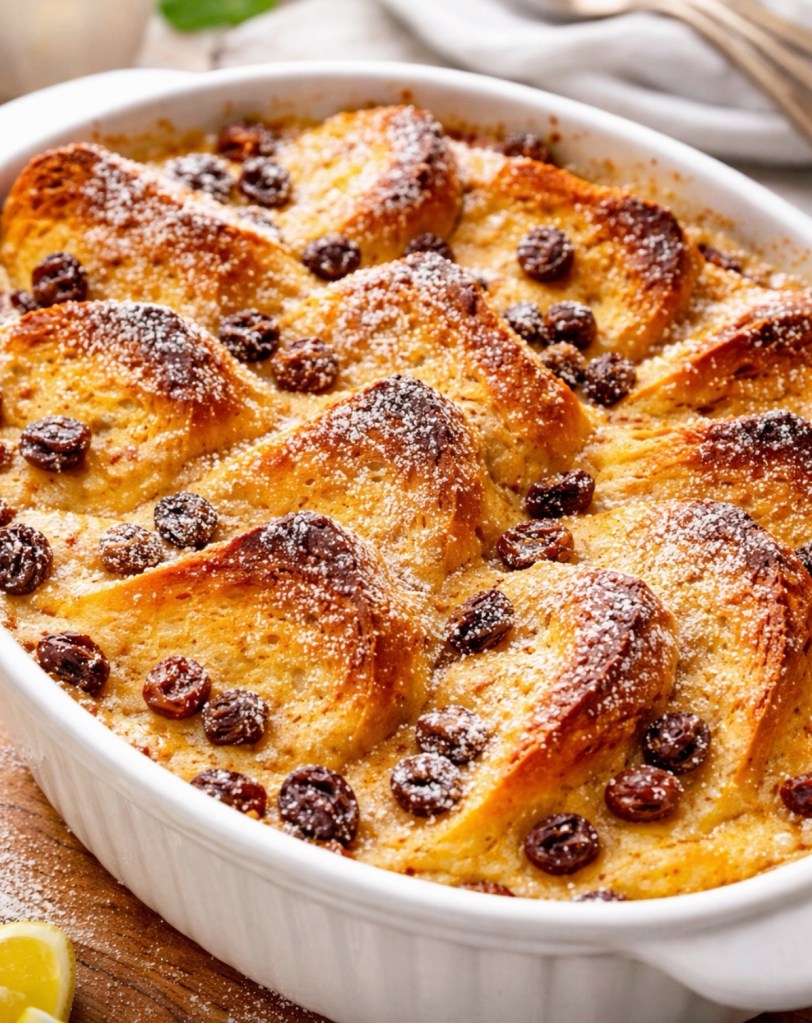 - Pour the mixture over the bread slices in the dish and spread the raisins evenly.